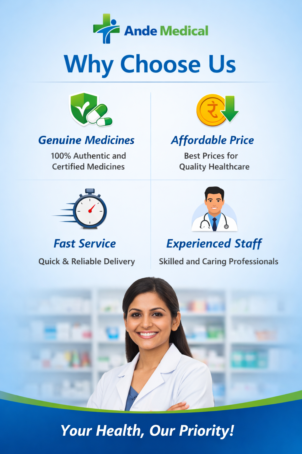 At Ande Medical, we are committed to providing high-quality healthcare products and reliable medical services to our community. Our goal is to make essential medicines easily accessible while ensuring safety, authenticity, and affordability for every customer. We offer a wide range of trusted medicines, health checkups, and expert consultation services to support your overall well-being. With a focus on customer care, fast service, and dependable home delivery, Ande Medical strives to be your one-stop solution for all healthcare needs.